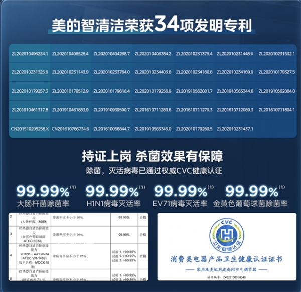 更有34项发明专利支持下的美的智清洁,层层工序高温除菌,除菌、灭活病毒效果经过权威CVC健康认证,健康有保障,全家更安心。