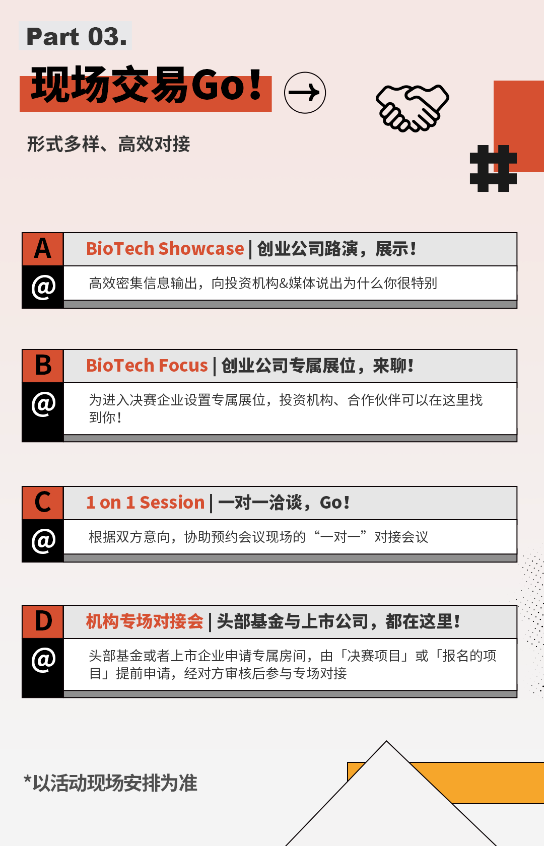 总决赛不仅将汇聚头部行业咨询机构、券商机构、头部企业和学术界大咖一道深入分析全球行业与生命科学领域的发展趋势,同时还有主流媒体曝光、现场对接洽谈等重点环节,届时欢迎各位评委及来宾持续关注,也欢迎大家扫描下方海报二维码报名参与。