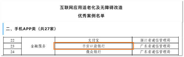 其中,平安口袋银行凭借着卓越的用户体验、贴心的产品设计和扎实的研发能力,成为与支付宝、微众银行共同入选的三家金融服务类App之一。而平安银行作为唯一上榜的传统金融企业,与互联网基因更加显著的阿里、腾讯并列,充分显示了其手机App平安口袋银行的适老化和无障碍改造工作不仅获得了工信部和同业的积极认可,同时也说明了平安口袋银行历经多年躬耕,无论用户体验、产品服务以及技术能力均已成为行业翘楚。