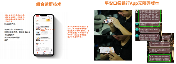 另外,无障碍的改造更强调功能的通用性以及与普通版本的业务功能一致性。为解决视障客群在使用互联网化金融工具时遇到的核心障碍,平安口袋银行通过上线“组合读屏”、“数字标签场景化”等特色功能,让视障用户能够“边听”边自主操作App,易用性得到了显著的提升。经部分视障用户表示,平安口袋银行能够兼容110多款手机型号,且能友好地贴合视障群体的日常生活习惯,体验颇佳。