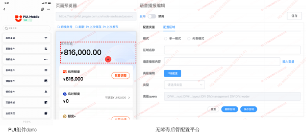 其次,针对银行存量但非核心功能的全面性及多样性,技术团队在整体开发过程中创新性地构建“PUI组件系统”和“可视化的后管配置系统”两个通用能力。在前端,可以将银行核心业务线批量接入,覆盖平安口袋银行共4000多个页面,并实现PUI全量组件100%适老化、无障碍适配改造;在后端,通过可视化的后管配置系统,可以对内容区域存量页面、基础性页面的配置变量、语音读屏内容、字体、隐藏区域、字体颜色实施“一键式操作”。整体来看,平安口袋银行适老化、无障碍改造实现了“敏捷迭代”、“批量改造”、“全量优化”,并与“精细化改造”相结合,确保了各存量非核心功能“先保证能用,再优化好用”,推动整体改造工作驶进快车道。