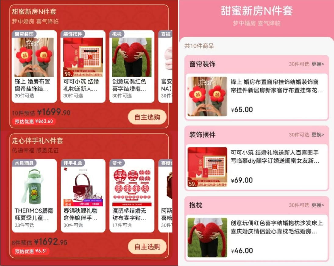 快节奏的工作生活下,时间精力有限的年轻人在备婚上亦追求省时省力。基于这一需求,京东婚庆季集结海量超出片的婚房装饰、床品套件、宝藏伴手礼,推出甜蜜婚房、氛围感客厅、喜气满满卫浴、户外/庭院婚礼、走心伴手礼多场景组套,供消费者一键“打包”,享受省心更省钱的套购方案。比如,消费者可选购打造甜蜜婚房场景所需的罗莱全棉缎纹四件套嫁娶、水星全棉刺绣中式婚嫁四件套、博洋长绒棉婚庆四件套、烟雨集结婚订婚宴布置全套、新新精艺婚房布置立体喜字贴、演绎礼金簿结婚记账本记名册、青苇丝绒喜糖袋等,以及用于伴手礼的大英博物馆新巴洛克香薰蜡烛套装、格沵(GERM)可口可乐联名智能保温杯等组套。针对多场景下的单品类,京东居家还提供数十件产品选择,既为消费者提供一键组合购买的便利,又满足了更多个性化婚房装饰、婚礼庆典需求。