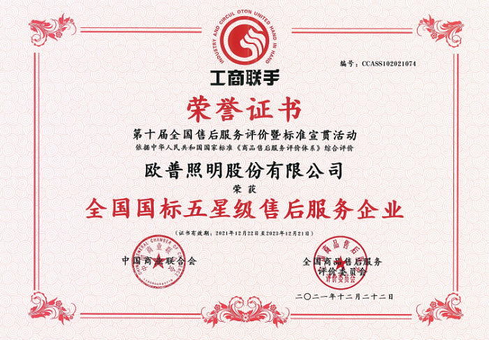 欧普照明荣获全国国标五星级售后服务企业
