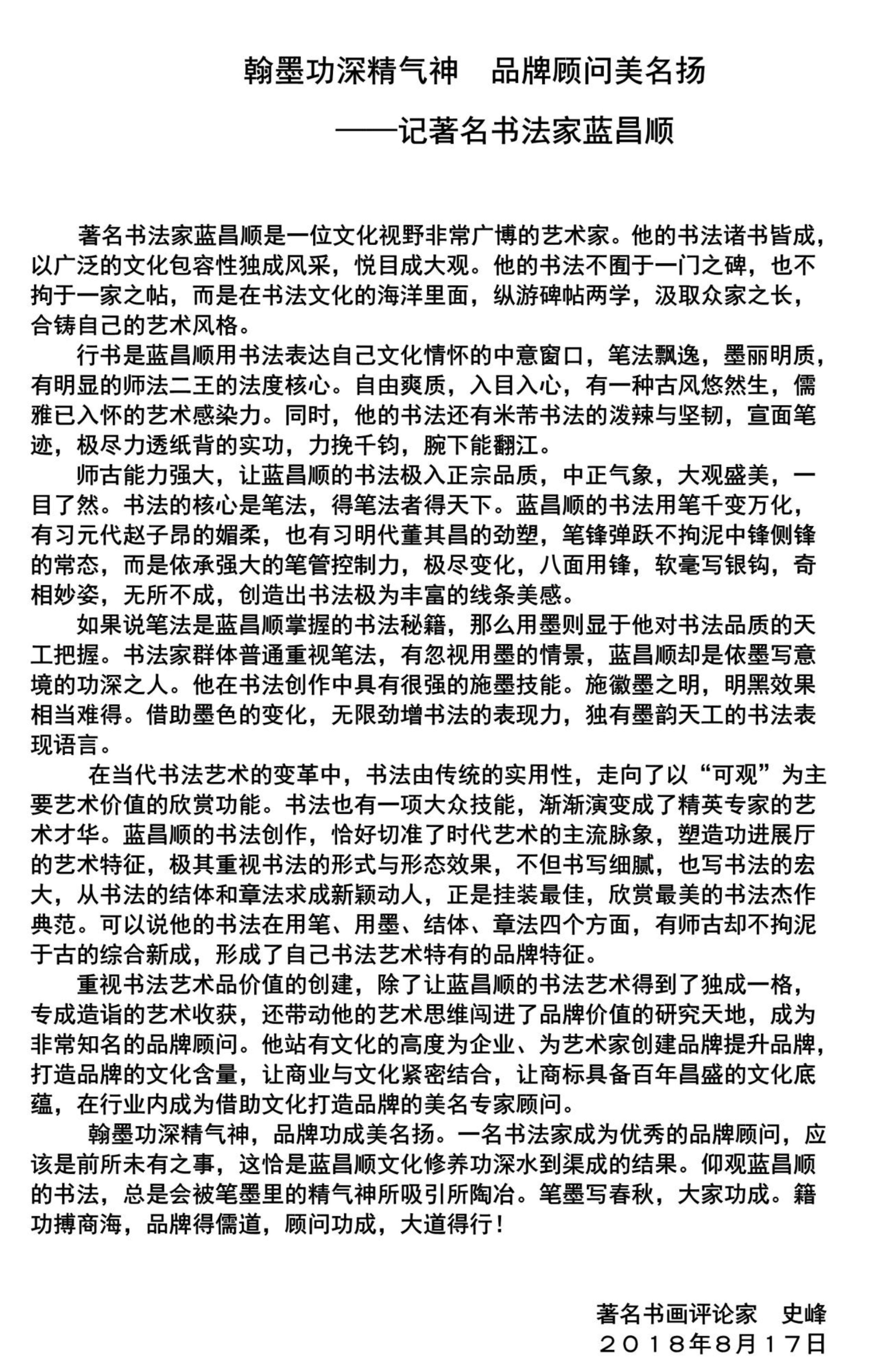 2018年11月蓝昌顺介绍和书法作品入编人民日报《人民周刊》杂志社和中国国际报告文学研究会联合出版的大型文献《聚焦·四十周年》;