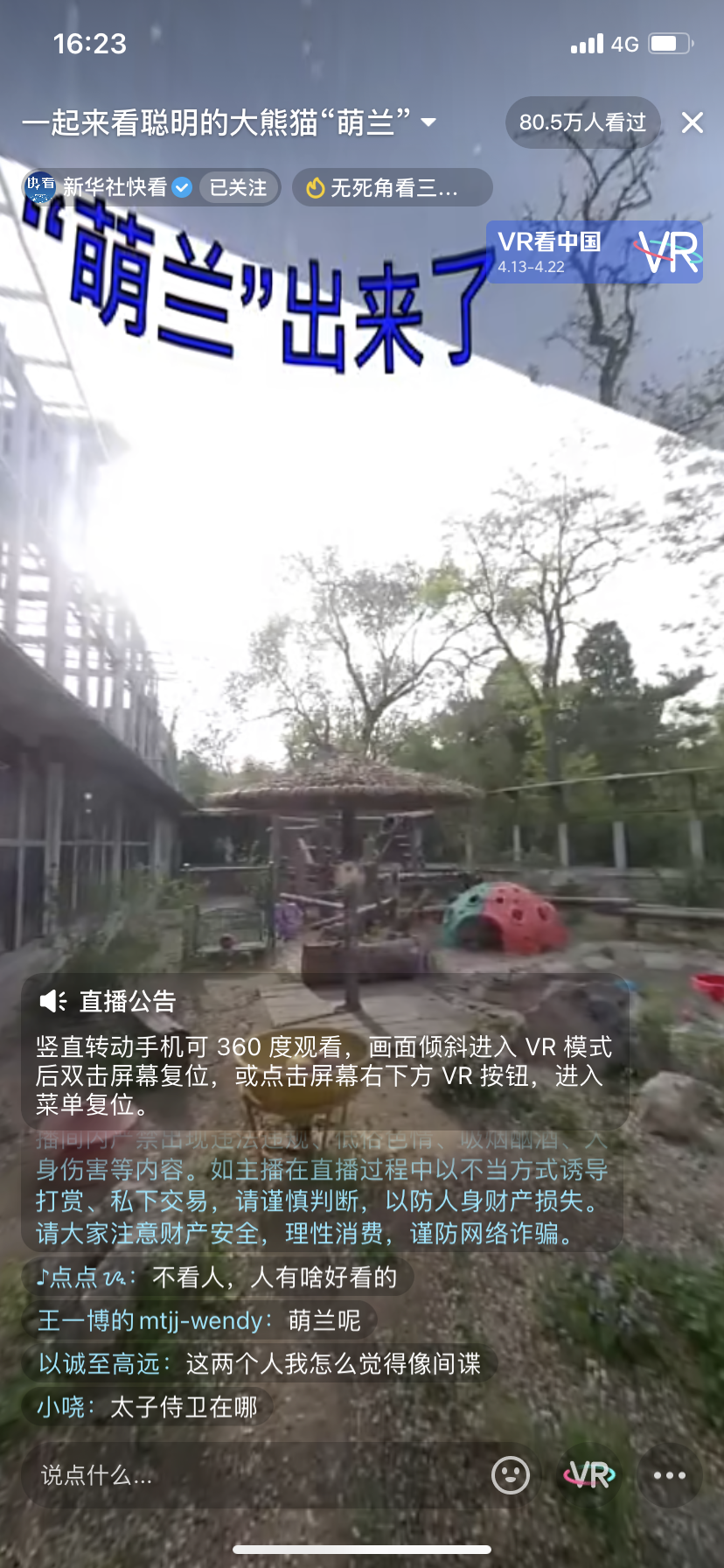 4月15日,新华社快看联合PICO开启了“西直门三太子”萌兰的直播,观众可以通过PICO VR一体机中的PICO视频应用和抖音App@新华社快看 官方账号直播两种方式沉浸式近距离观看大熊猫,PICO 4 VR一体机所具备的4K+超视感屏与空间音频,让观众仿佛置身现场,全身心地融入萌兰的生活中,感受大熊猫的欢乐气息。萌兰的出场瞬间吸引了80多万观众的关注,可谓是“流量担当”。打开螺旋仪,手指滑动屏幕就可以360度观看,手机端也可以通过竖直转动切换屏幕实现直播视角自由。在这里,用户不仅能看到萌兰在自己的“游乐场”里嬉戏玩耍,还可以关注到场外完整的环境和人流穿梭,以便规划自己的游玩行程。