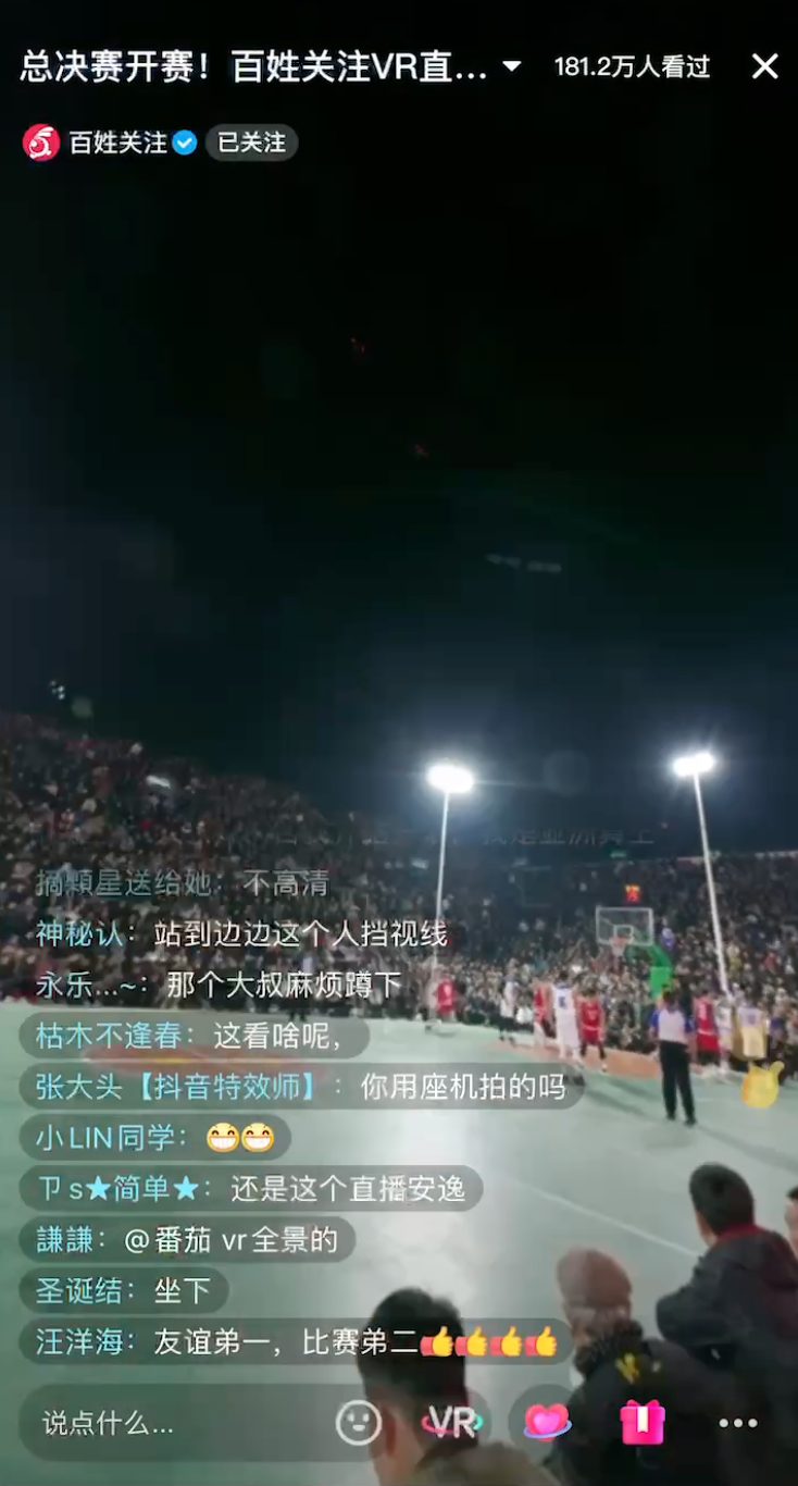 春潮涌动,万物复苏的季节又到来了。在全民运动的社会大背景下,国民健康意识越来越高。不久前,贵州省“村BA”总决赛开赛,贵州广播电视台公共频道官方抖音账号《百姓关注》开展了VR全景直播,为观众沉浸式展现篮球赛盛况。赛事一上线就受到了大众的广泛关注,经统计,本次赛事直播共有300+万的播放量,最高同时在线人数接近两万,突破1亿曝光量,占据抖音全国榜榜首。