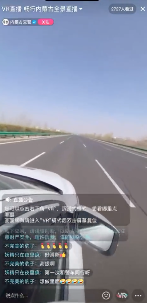 和交警同行是怎样的体验呢?4月18日,内蒙古交警在抖音端发起直播,不少用户也通过PICO 4 VR一体机见证了内蒙古广阔平坦的公路和如画的风景。在全景模式下转动手机就能360度观看旁边的风景,并和身边的交警来场近距离互动。这种创新的直播形式带给用户新奇独特的体验,PICO 高清的画质以及更宽广灵活的视野范围,则让用户真正能全方位地感受直播空间场景。用户表示“仿佛真的坐上了交警的副驾,行驶在内蒙古公路上”。