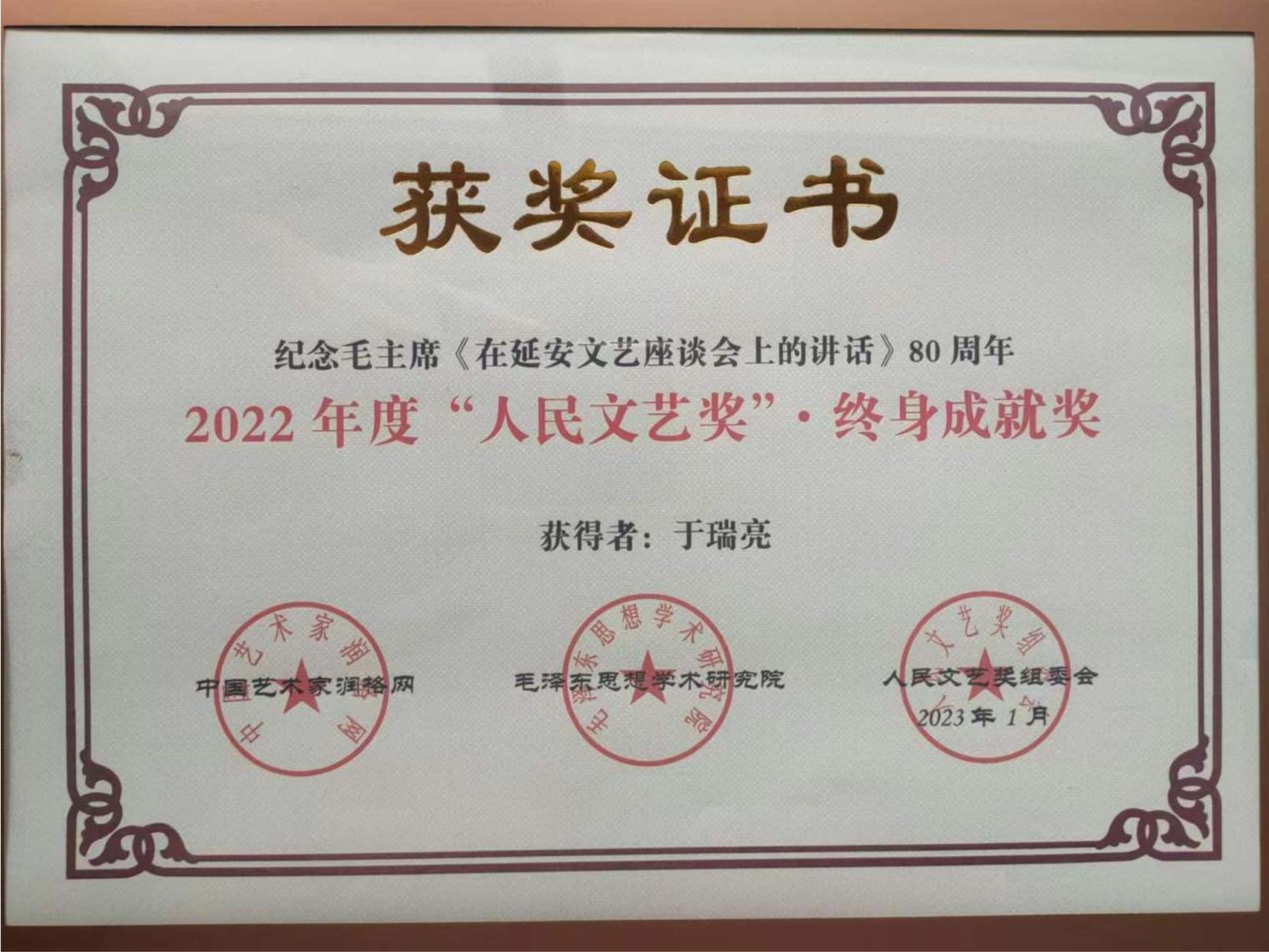 2023年1月在纪念毛主席《在延安文艺座谈会上的讲话》80周年被授予2022年度“人民文艺奖”终身成就奖。2023年四⺝由国学联盟艺术网,中央电视台CCTV央视网,国学春晚组委会:授予"大國功臣″荣誉称号。