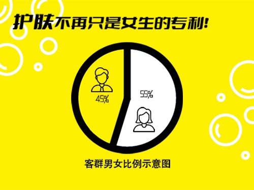 洗脸猫品牌自成立以来,便以用户体验为主,对服务不断进行升级,获得一众年轻消费者的认同。传统的美容护理主要受众群体是女性,而洗脸猫在创立之初便提出过这样一个主张——护肤并不是女性的专利,在此护肤主张的宣导下,更多的男性客户走进洗脸猫,据洗脸猫官网数据显示,洗脸猫的客群占比为:女性55%,男性45%。