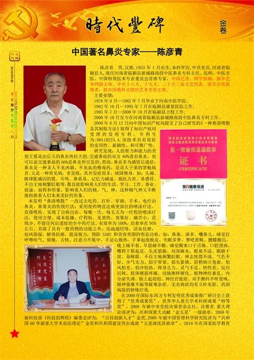 陈彦青,男,汉族,1953年1月出生,本科学历,中共党员,河南省临颍县人,现任河南省临颍县新城路南段中医鼻炎专科主任、医师、中医名医、中国特效医术专业委员会首席专家、中国艺圣、国家一级书画师、中医教授、国学领袖。