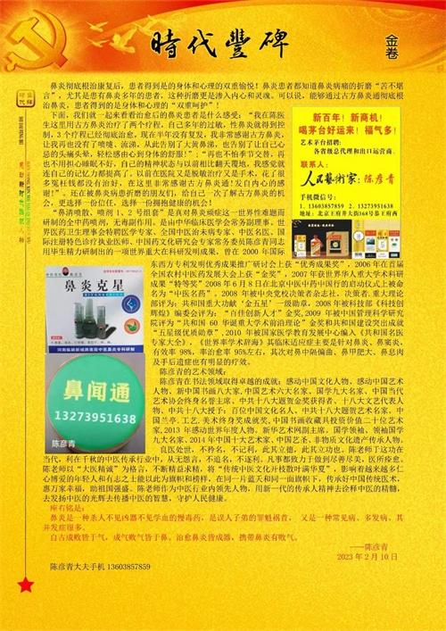 欢迎你致电中医鼻炎专科、国学领袖、中国艺圣陈彦青。陈彦青大夫不但医术精湛,艺术也是可圈可点!因此被国家誉为国家一级书画师。其书法作品被称作艺术软黄金。享誉海内外。