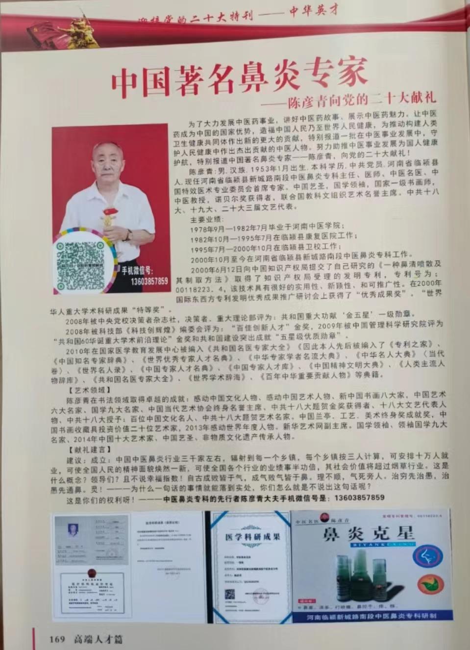 献礼中共二十大,一带一路显神通。中医中药行天下,各种疫情祛无踪。全球百姓享太平。——中医鼻炎克星陈彦青大夫