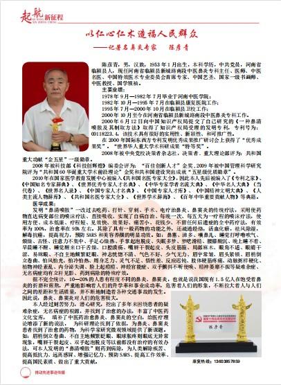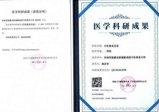 2008年6月8日在北京中医中药中国行的启动仪式上被命名为“中医名药”。2008年被中央党校决策者杂志社,决策者.重大理论部评为:共和国重大功献‘金五星’一级勋章,2008年被科技部《科技创辉煌》编委会评为:“百佳创新人才”金奖奖,2009年被中国管理科学研究院评为“共和国60华诞重大学术前沿理论”金奖和共和国建设突出成就“五星级优质勋章”,2010年被国家医学教育发展中心编入《共和国名医专家大全》,《世界率学术辞海》其临床适应症主要是针对鼻炎、鼻窦炎,有效率98%,,率治愈率95%左右,其次对鼻中隔偏曲、鼻甲肥大、鼻息肉及手后遗症也有明显的疗效。