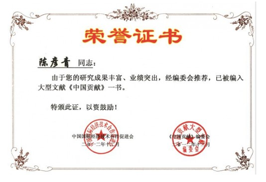 2008年被科技部《科技创辉煌》编委会评为:“百佳创新人才”金奖,2009年被中国管理科学研究院评为“共和国60华诞重大学术前沿理论”金奖和共和国建设突出成就“五星级优质勋章”。