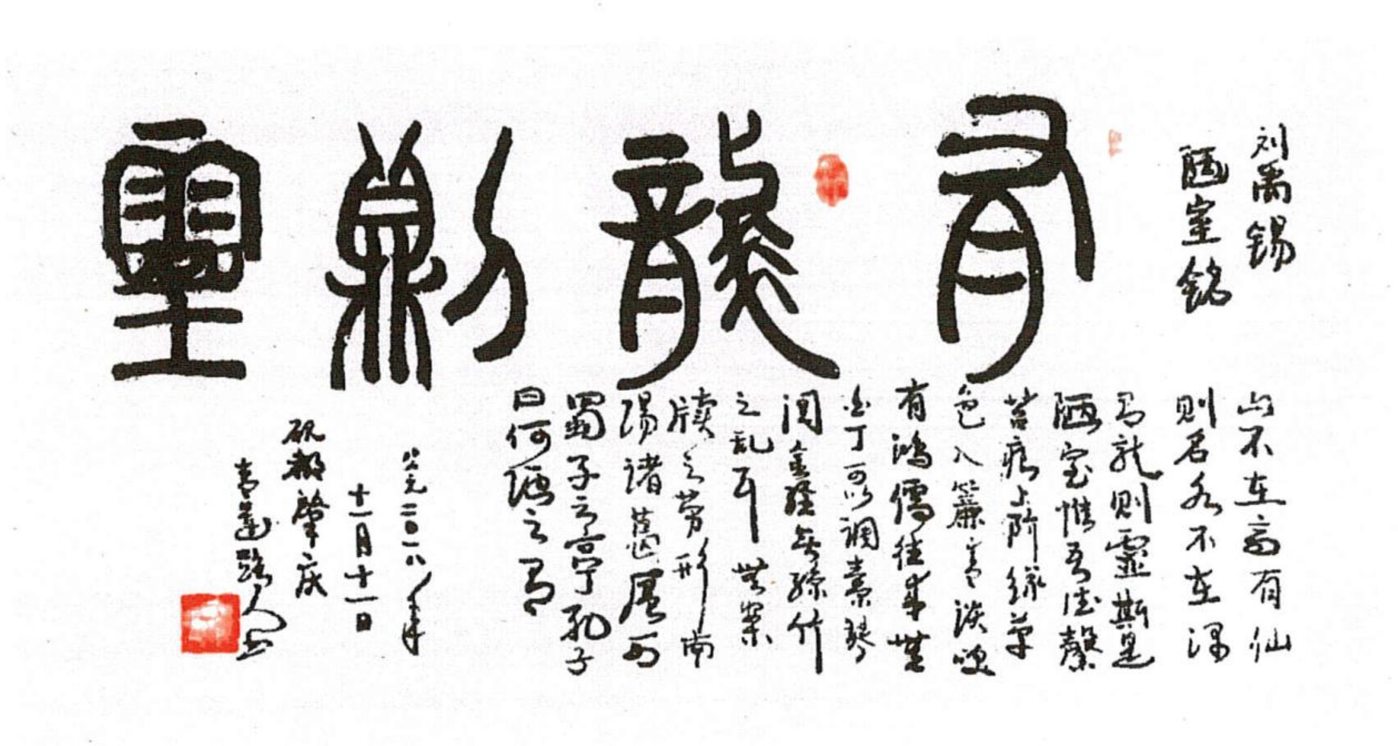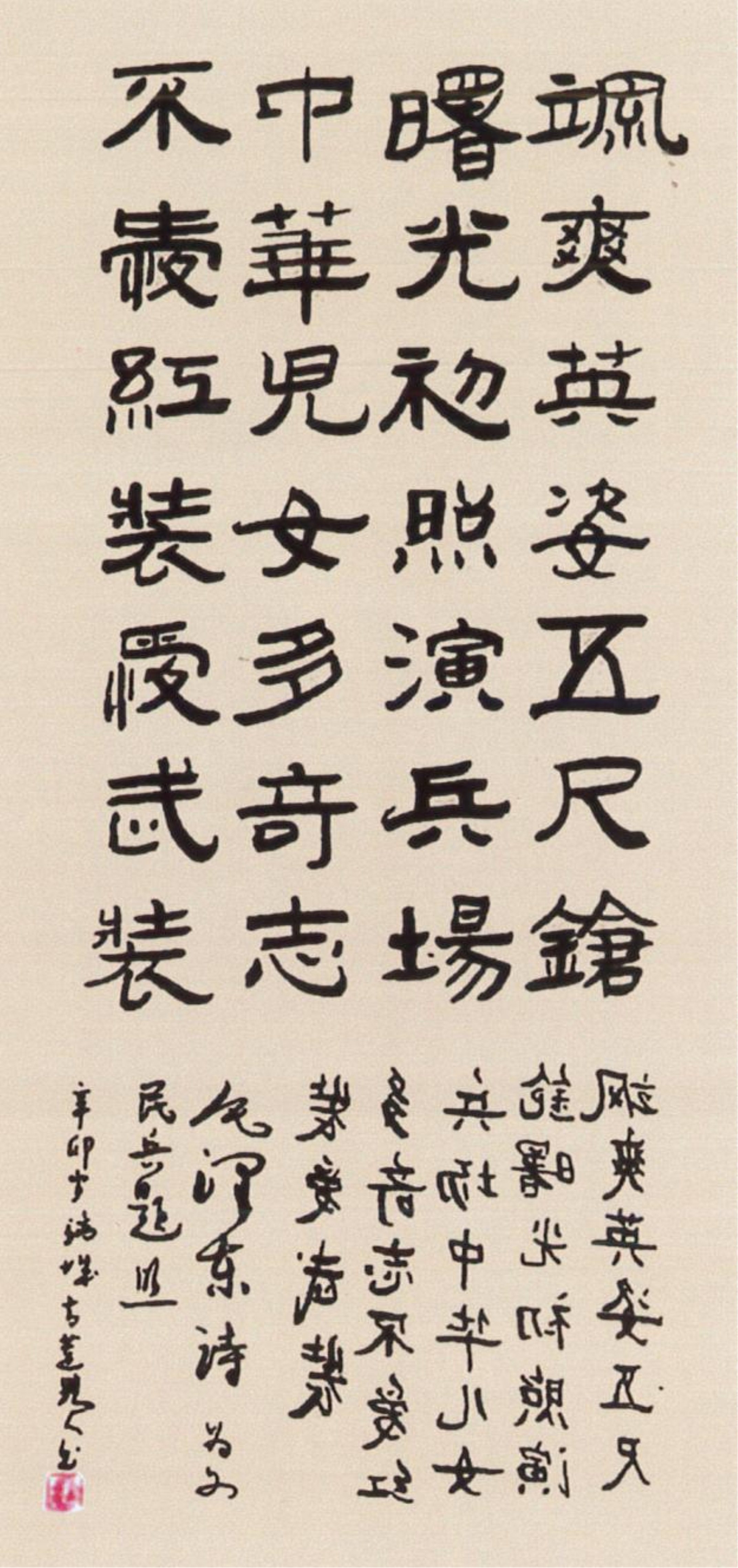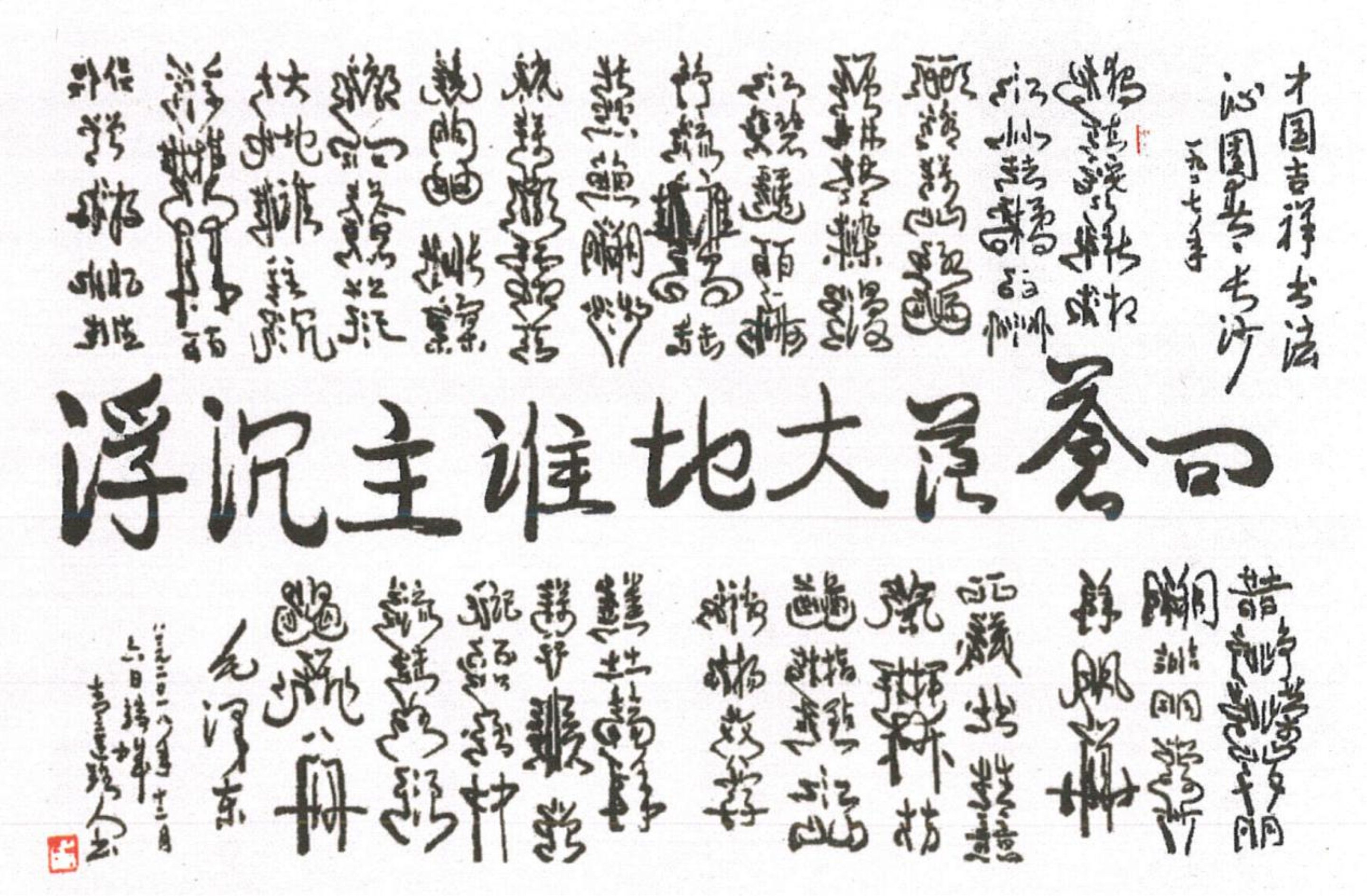 主要书法作品有:隶书《三国演义》(70万字8400米)篆书《孙子兵法》、《论语》、行草书《聊斋志异》(60万字5000米)等。经70年6个阶段的探索,终于成功地首创出“中国吉祥书法”。领导认为它成为书法史上的里程碑,成为当今文化“自信”中的一个大大的亮点。
