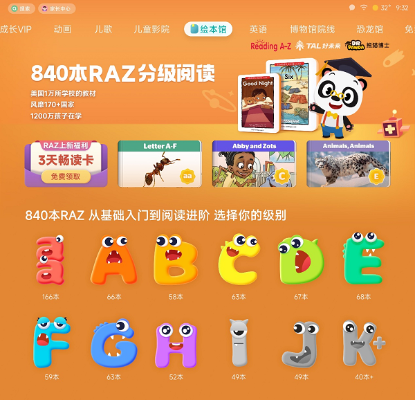 不同于动画内容的轻松愉快,英语学习可谓是大部分家长们心中的痛中之痛,有什么方法可以让孩子们对英语学习产生兴趣呢?大屏阅读又能在家庭场景中起到什么作用呢?小米电视儿童频道又做到了思家长之所思,想家长之所想:分级阅读界最强王者ReadingA-Z(RAZ)系列绘本也宣布入驻小米电视儿童频道!