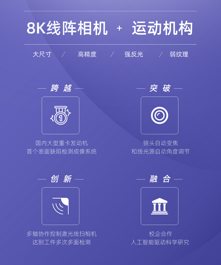 此项目是国内首个针对大型重卡发动机表面缺陷检测的成像系统,从技术层面实现了镜头自动变焦和线光源自动角度调节,同时能够满足多轴协作,控制激光线扫相机达到工件多次多面检测。项目所有硬件产品皆由摇橹船科技自主研发设计,其中8K线阵相机+运动机构具备大尺寸、高精度、强反光、弱纹理的专业特点。