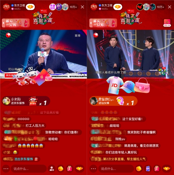 不仅如此,快手还在晚会内容中对京东服饰进行深度植入,引入“618买服饰,来京东才够省”、“跨店每满300减50,每天还有60元额外补贴”、“新人专享好物,低至1分购”等关键信息,不断强化京东品牌利益点。例如,张海宇、孙珍妮在喜剧表演后,携手主持人百克力,通过明星的角色演绎引申到服装造型变化话题,在对话中自然植入京东服饰的利益点,让商业内容与节目内容融合更加顺畅自然,而明星的卷入也进一步增强了品牌植入内容的影响力。