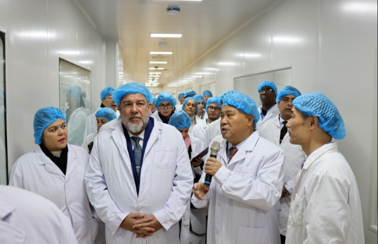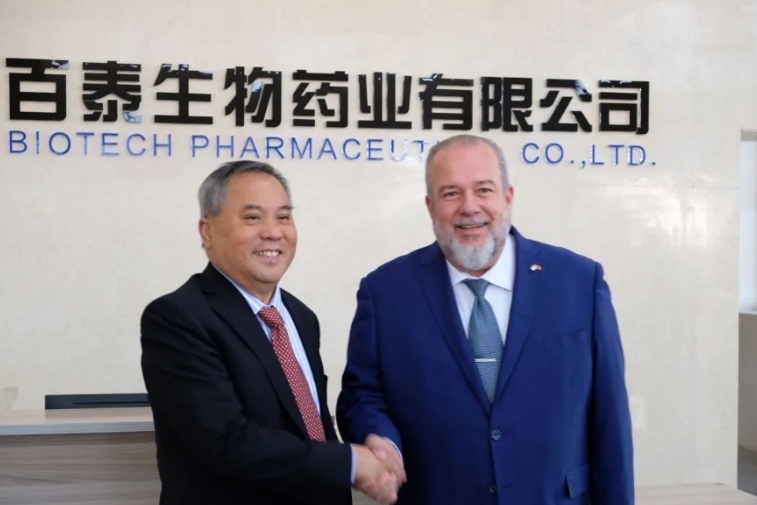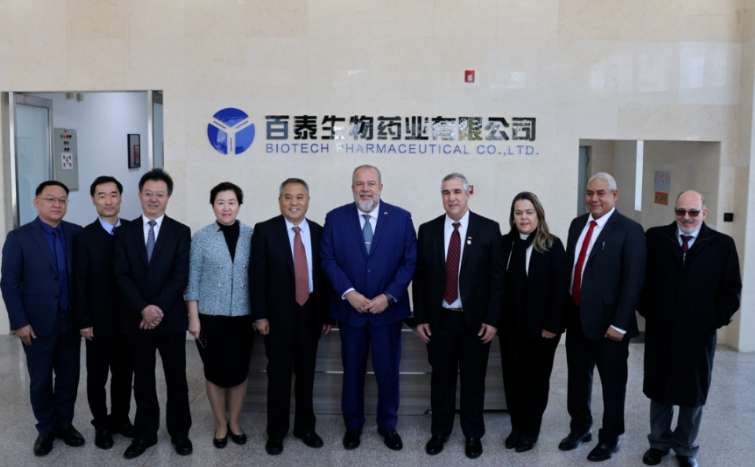 2023年11月8日,古巴总理马雷罗率代表团访问百泰生物药业有限公司。古巴生物医药集团总裁爱德华多·马丁内斯先生、对外投资贸易部副部长德博拉·撒维达女士、古巴驻华大使白诗德先生、中国驻古巴大使马辉先生、古巴驻华使馆公使衔参赞伊格尔等全程参加了活动。