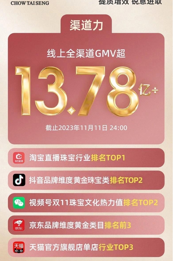 随着2023年11月11日24点的落幕钟声敲响,备受瞩目的民选“国货之光”——周大生,以GMV超13.78亿的傲人战绩迎来完美谢幕。此次双十一战绩不仅刷新去年创下的9.4亿记录,巩固了其在珠宝行业的领先地位,更重要的是,其产品策略与市场精准对接,展现了深厚的产品力、敏锐的市场洞察力和创新力。