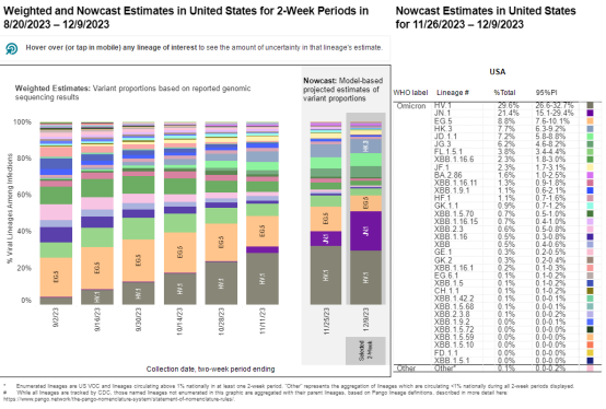 于今年8月首次被发现的变异株JN.1是BA.2.86的分支,直至11月流行趋势都较弱,然而近几周该变异株在人群中的感染率有明显增加。根据美国疾控中心12月9日发布的新冠病毒变异株实时预报显示,JN.1的占比从9月2日不足0.1%,大幅飙升至11月11日的3.5%,预计12月9日将会升至21.4%。