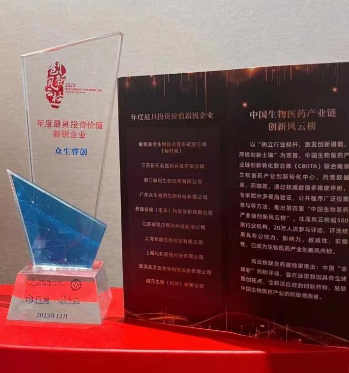 12月15日下午,第四届中国生物医药产业链创新转化国际峰会,暨第四届中国生物医药产业链创新风云榜颁奖典礼在杭州顺利举行。众生睿创荣获2023年第四届中国生物医药产业链创新风云“年度最具投资价值新锐企业”称号!