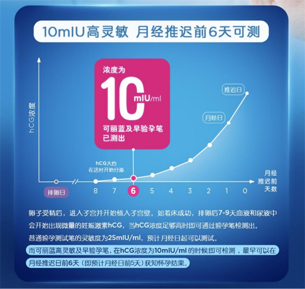 通常验孕测试笔的灵敏度在25mlU/ml 到50mIU/ml之间,预计月经日后才可以测试。而可丽蓝新品“及早验孕棒”的灵敏度可以达到10miu/mL,在怀孕的第一时间就可以知道,最早可以在月经推迟日前6天(即预计月经日前5天)获知怀孕结果,让女性不用等到月经日延迟就能马上知道结果。