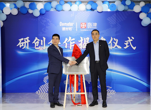 (德米特董事长王峰与岛津公司事业部部长吴彤彬代表双方揭牌)