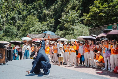 巡游NPC互动包括但不限于“公主抱、猜拳、掰手腕、簪花、抛绣球、国风美女舞蹈演出、亲密贴贴”等形式,线路主要从舞台到瀑底观景台进行巡游,备受瞩目和欢迎,游客们也在整个过程中热情高涨。NPC们热情有趣的回应,惹得游客们纷纷露出幸福的笑容,现场热闹又欢乐的氛围弥漫整个景区;本次活动还融合了国粹“武术”快闪,游客可感受中华武术一招一式中蕴含的中华智慧,同时领略赤水丹霞独特的自然魅力。