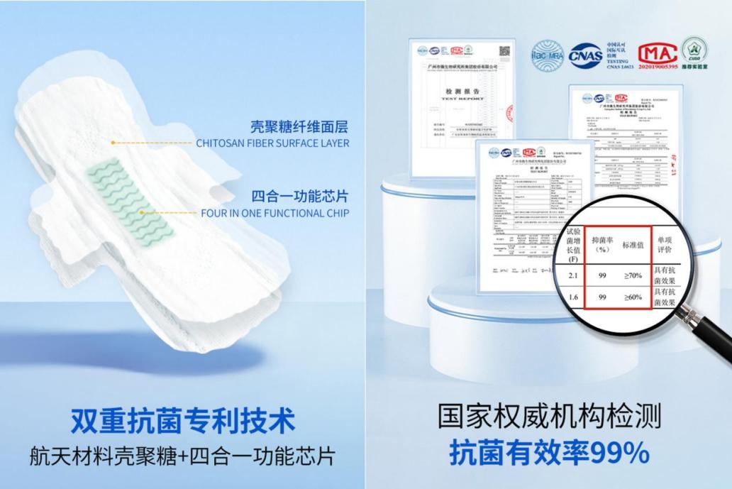 好斯来斯目前已经上市的核心产品是壳聚糖抗菌卫生巾,它采用双重抗菌专利技术,面层为壳聚糖纤维,第二层植入四合一抑菌功能芯片,确保每一片卫生巾都具有99%的抗菌功能,从而减少细菌的滋生,预防妇科炎症的发生。