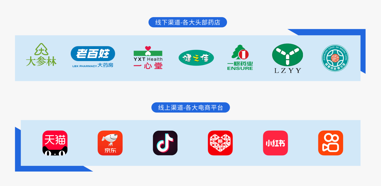 线下渠道:产品已进驻大参林、老百姓、一心堂、健之佳、德生堂、柳药集团、一树药业等全国10万+药店
