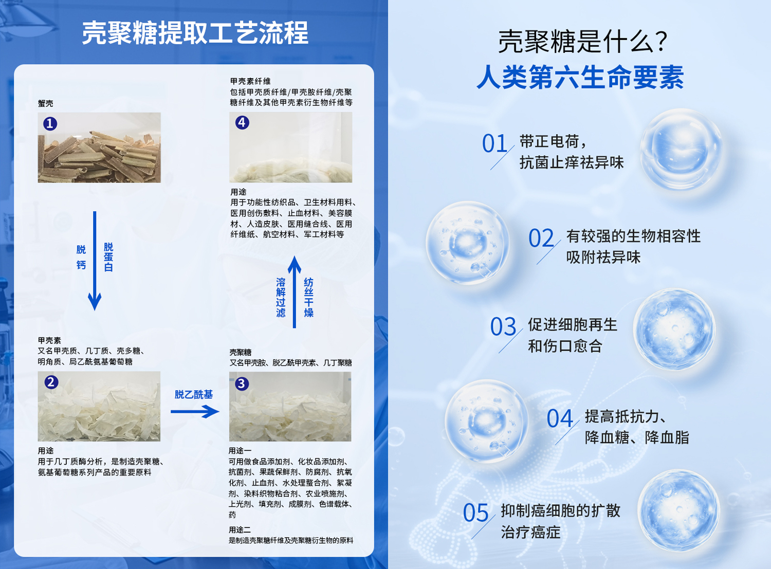 "壳聚糖"是大自然赐予人类的珍贵礼物,早在四百年前中国人就发现了壳聚糖的价值,《本草纲目》里就有关于壳聚糖前身的记载。而在现代生物医学领域,欧美科学家把壳聚糖誉为“人类第六生命要素”。壳聚糖是从螃蟹和虾的壳中提取的天然高分子海洋生物材料,是自然界中唯一天然带正电荷的物质。其正电荷可以中和细菌蛋白酶中巯基的负电荷,从而使蛋白酶丧失活性,细菌因缺少蛋白酶的营养供给而不能存活和繁殖,所以壳聚糖具有超强的抗菌能力,且无任何毒副作用。壳聚糖还具有奇特的六边形分子结构,具有显著的生物相容性,超强的吸附祛异味能力。同时,壳聚糖还具有促进细胞再生和伤口愈合、提高抵抗力、降血糖、降血脂的功能。壳聚糖与相关药物配伍,还可以抑制癌细胞的扩散,用于治疗癌症。