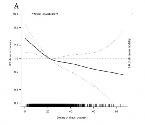第二篇人类研究是与癌症患者相关。研究人员筛选了超过8万2千个人资料以后最终选择了3504位符合条件的癌症病人。收集了他们的生理数据,生活饮食习惯和烟酸的摄入量,并且分析了烟酸摄入量和他们癌症死亡率与全因死亡率之间的关系。在把各种因素调整完以后的分析结果发现,在癌症病人中,对比每天服用10毫克以下的烟酸,每天服用37毫克以上的烟酸的人群的癌症死亡风险会低49%,而全因死亡风险会低27%。对于全因死亡风险来说,每天25毫克以上的烟酸不会有额外的收益,但每天额外补充烟酸还可以进一步降低癌症死亡风险,每天服用76.4毫克的烟酸可以让癌症死亡风险降低52%,而且研究人员发现这还不是极限,如下图所示。