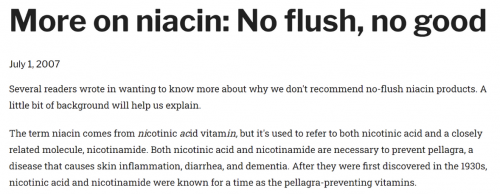 因为烟酸的红热反应经常被误解,所以一些药厂开始研发可以缓释型的烟酸来减少红热反应。但这一步弄巧成拙了。在两篇大型的人类临床AIM-HIGH和HPS2研究中,缓释烟酸与其他药物合用被发现反而会增加全因死亡风险。而哈佛大学也发表过一篇推荐潮红烟酸的文章《no flush, no good》。
