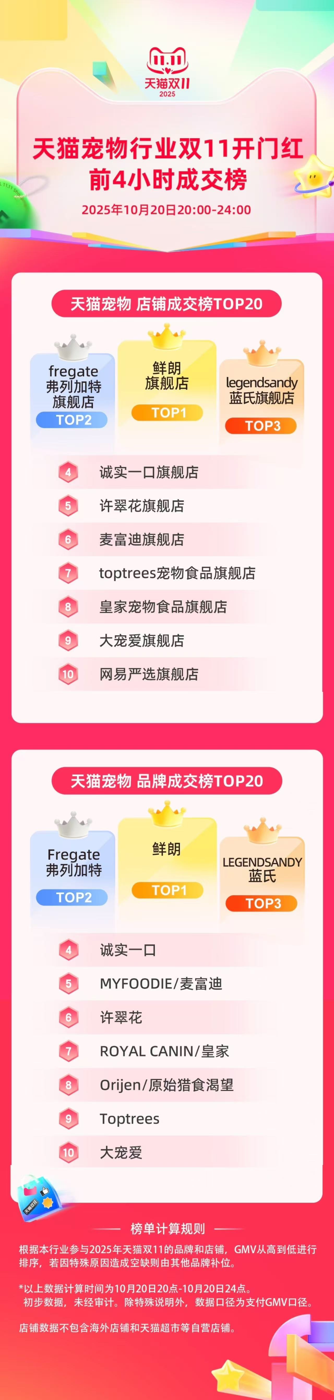 在2025年天猫双十一大促中,鲜朗以压倒性优势稳居宠物主粮品类销量榜首,实现了名副其实的“断层第一”。根据淘宝天猫发布的官方战报,鲜朗旗舰店成功登顶天猫宠物店铺成交榜TOP1,同时鲜朗品牌也位列天猫宠物品牌成交榜TOP1