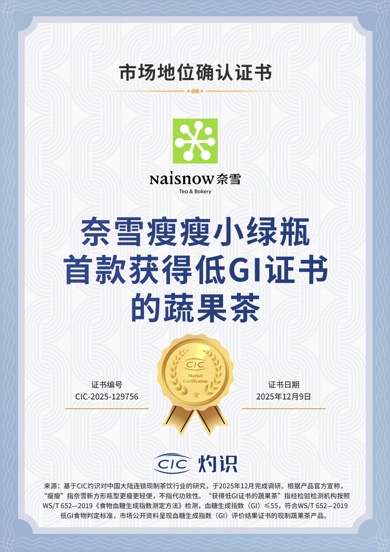 12月9日,奈雪的茶旗下明星单品“瘦瘦小绿瓶”蔬果茶获全球咨询机构CIC灼识权威认证,被正式授予“行业首款获低GI证书的蔬果茶”市场地位确认。此前,该产品已通过专业检测,GI 值低至 37(远低于≤55 的低 GI 标准),双重权威背书进一步夯实其健康茶饮标杆地位。