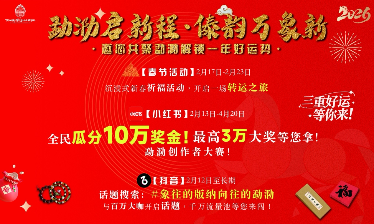 2026年2月12日至24日,在小红书发布勐泐实拍笔记,带话题#寻梦勐泐春节有戏并@西双版纳勐泐文化旅游区(官方),在文案中注明“参与勐泐创作大赛”,即可参与瓜分10万元现金池,优秀创作者更有机会赢取万元大奖。