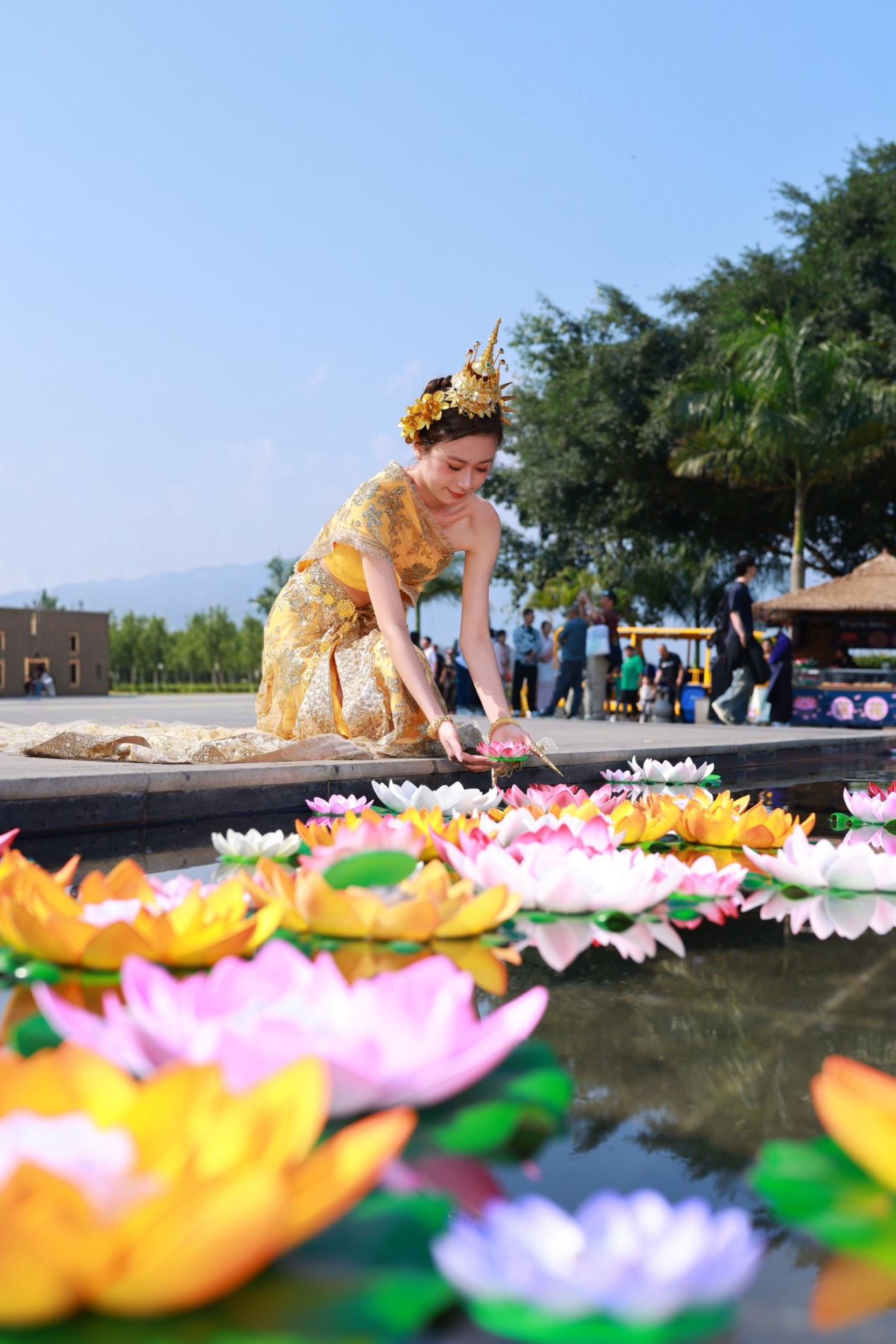 除了祈福体验,游客还将欣赏到极具傣族特色的文化演出。皇家仪仗队将在大金塔进行庄严的绕塔祈福;傣王傣王妃将在莲花水灯池举行水灯祈福仪式;此外,还有祈福孔雀舞在80罗汉台阶精彩上演。这些活动将带领游客穿越时空,领略古傣王朝的皇家气派与傣乡风情。