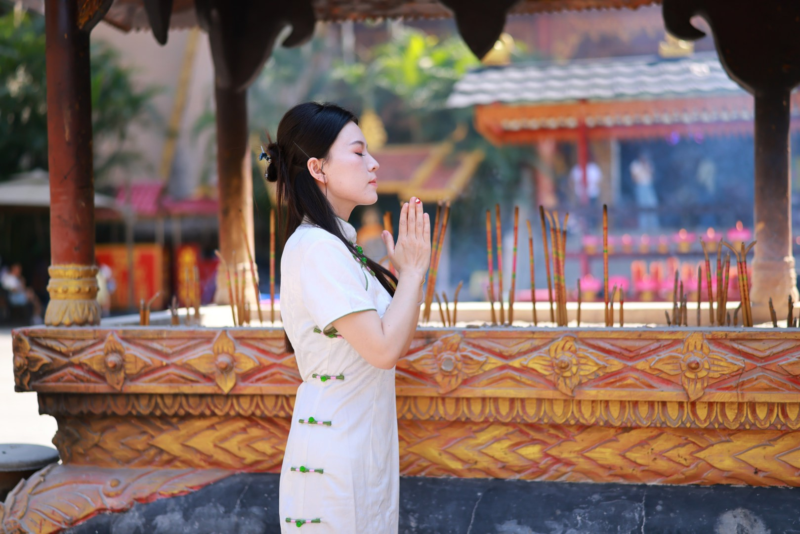 本次新春活动以“祈福纳祥”为内核,匠心打造五站祈福之旅。游客可持文牒依次探访五个站点,为新年许下美好期许,开启充满希望与祥瑞的新一年。游客持文牒可开启一段寓意深远的祈福路线:从金塔绕塔摇铃转运,到莲花水池放灯祈愿;从菩提树下贴树纳灵,到吉祥大佛登阶纳祥,最后在景飘大殿礼成圆满。