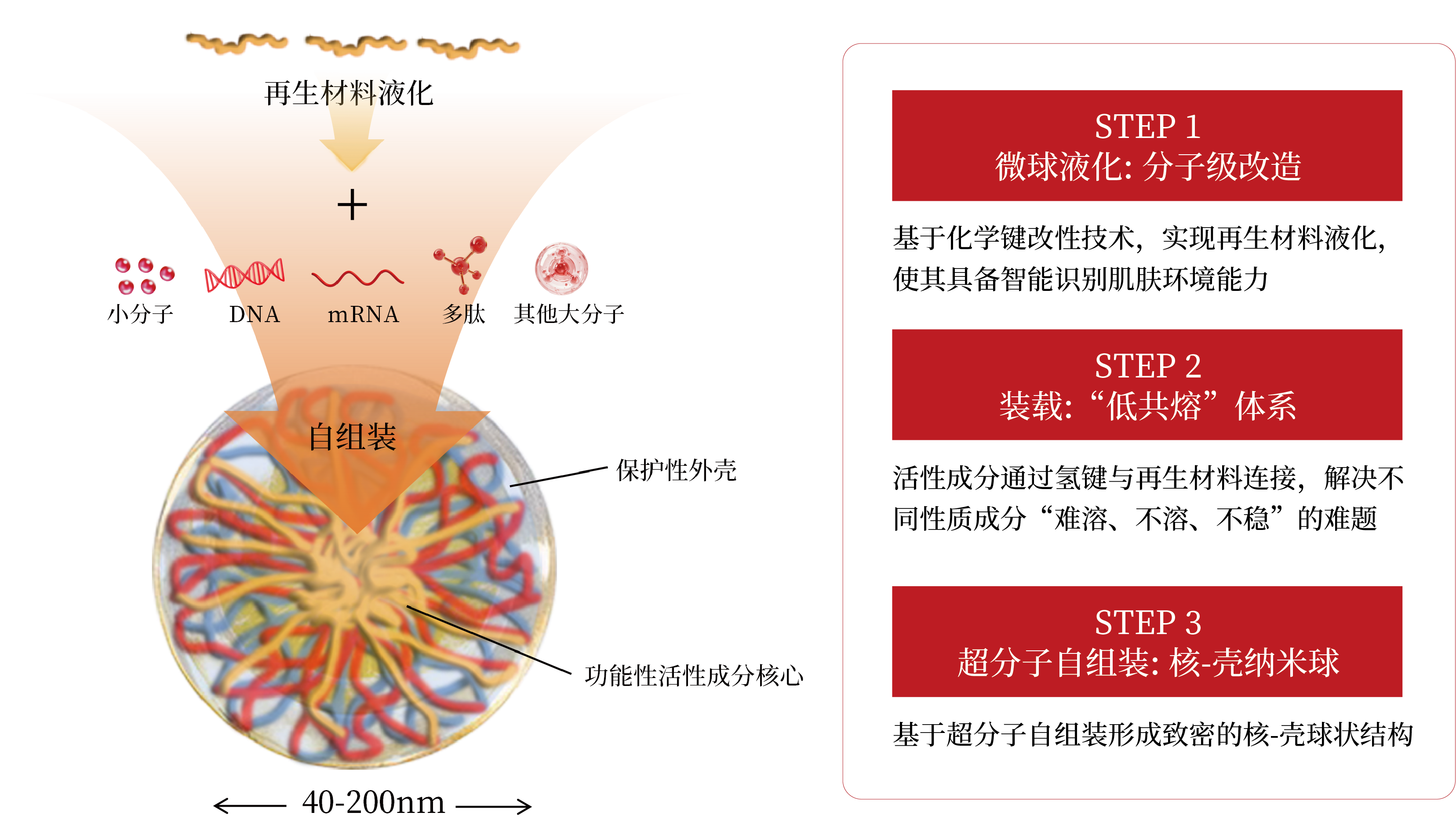超分子自组装:原料在水体系中形成 40–200nm 的核-壳状纳米载体,如同“纳米穿梭机”般精准穿透角质层。