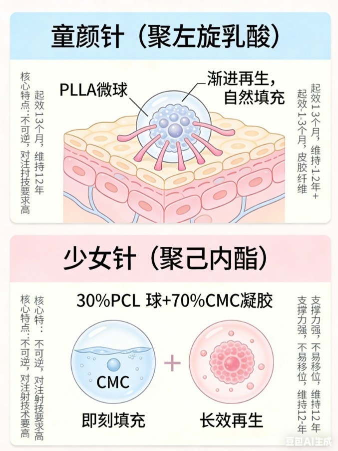 聚甲基丙烯酸甲酯:一种永久性填充材料,虽然维持时间长,但因不可降解且存在远期并发症风险,目前在主流医美应用中已非常谨慎,多用于特定医疗修复。