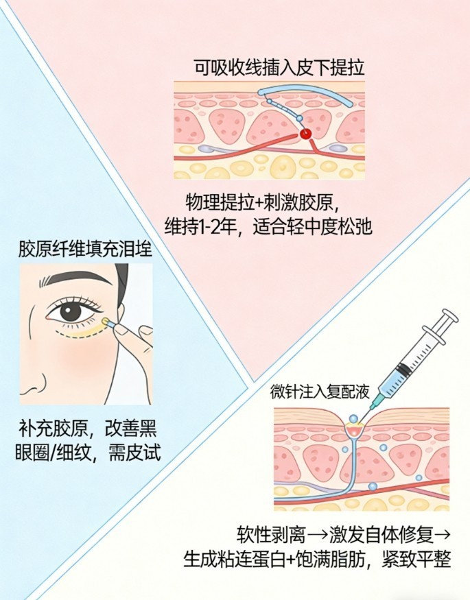 线雕:利用可吸收线(如PDO线)植入皮下,通过物理提拉即刻复位下垂组织,并刺激局部胶原增生。适合轻中度松弛(如苹果肌下垂、下颌线模糊),效果维持1-2年。