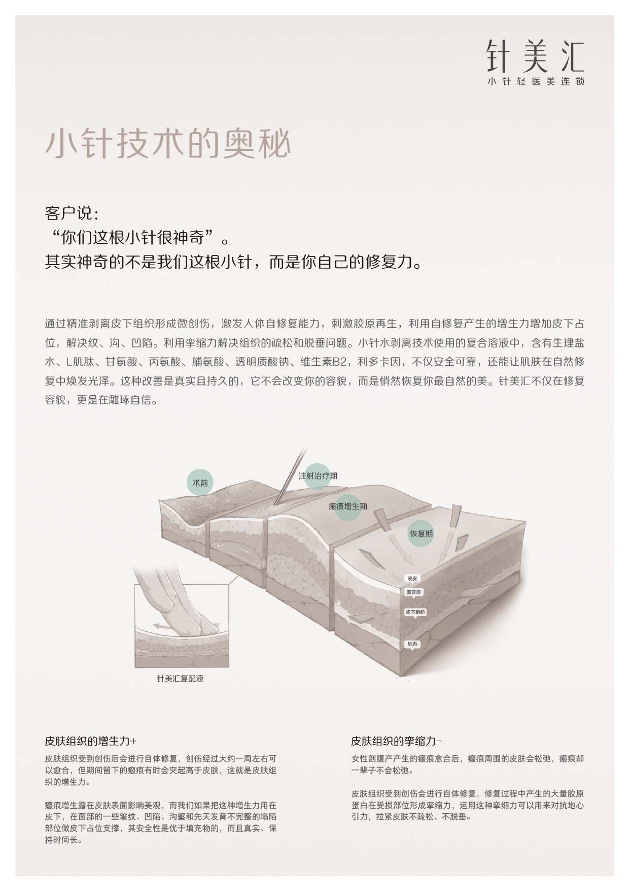 针美汇小针自体修复技术:在衰老脱垂的关键点,将含有丰富营养成分的针美汇复配液(生理盐水、非交联透明质酸钠等多种可吸收成分)注入到皮下,利用液体的软性剥离作用在皮下形成“微创伤”,人体组织受到创伤会激发自体修复能力。促进皮下大量粘连蛋白生成并连接成网,同时针美汇复配液的多种营养成分为周围的脂肪细胞提供营养,使其恢复饱满水润,新生的粘连蛋白和饱满脂肪实现相互作用,共同增加皮下占位,使皮肤恢复紧致平整。