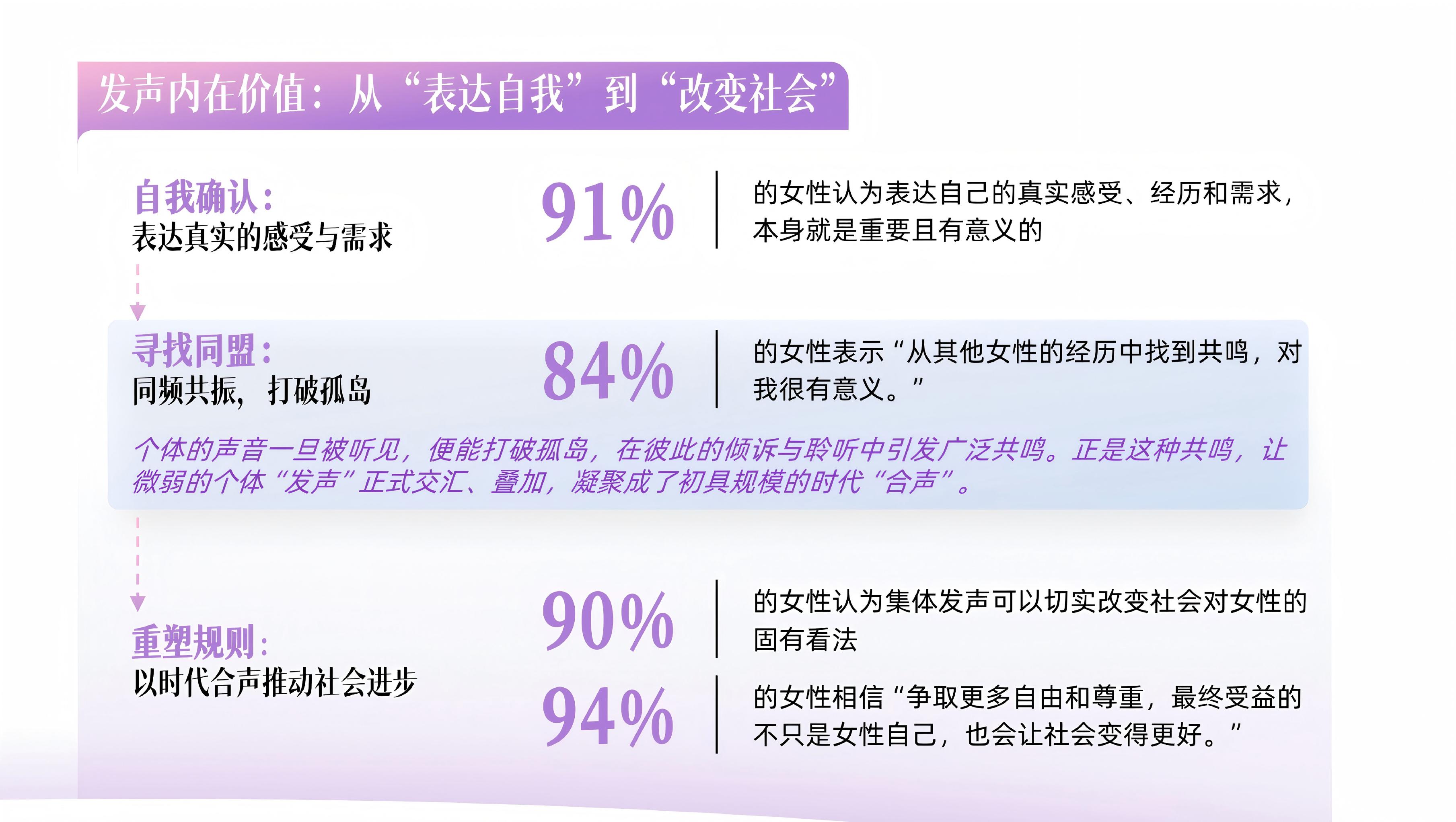 发声的价值,早已超越自我表达:从确认自身真实感受,到勇敢主动地发出自己的声音,越来越多的女性意识到——每一次发声都很重要,既是在寻找共鸣,也是在给他人力量。从个体表达到彼此共鸣、打破孤独,再到以集体力量改变社会固有认知,越来越多女性坚信,争取更多自由与尊重,最终受益的不只是女性自身,更会让整个社会变得更包容、更美好。