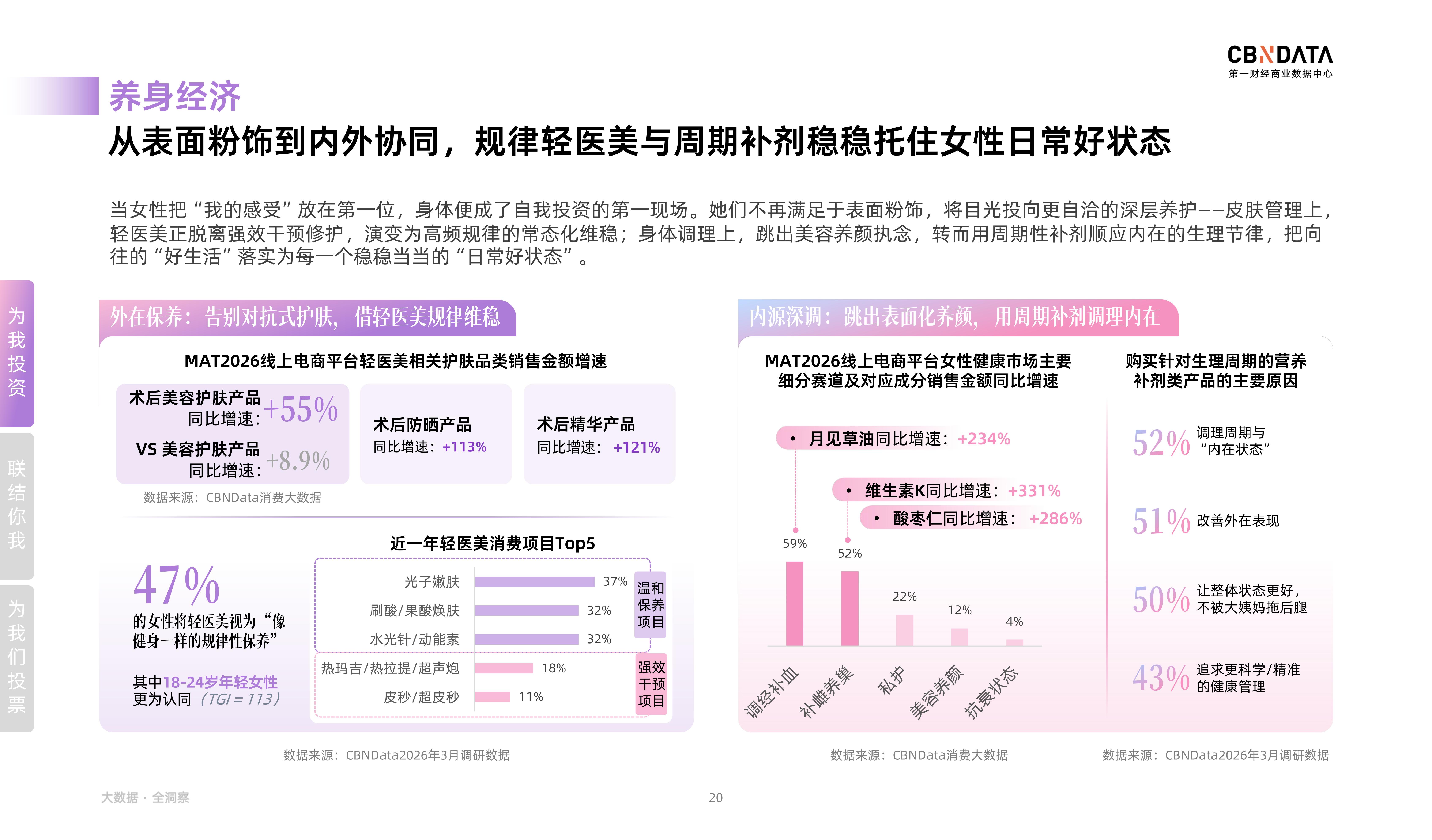 越来越多的女性将身体视为自我投资的第一现场,“养身消费”的具体表现在于女性消费者开始从表面粉饰转向内外协同的深层养护。外在保养上,轻医美正脱离强效干预,演变为高频规律的常态化维稳,术后修复类产品增速显著。47%的女性将轻医美视为“像健身一样的规律性保养”。同时,在内在保养上,女性也开始跳出美容养颜的执念,转而用周期性补剂顺应生理节律,从“为悦己者容”转向“为悦己而养”。