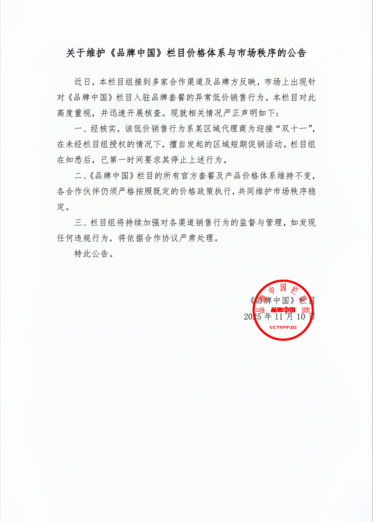 关于维护《品牌中国》栏目价格体系与市场秩序的公告