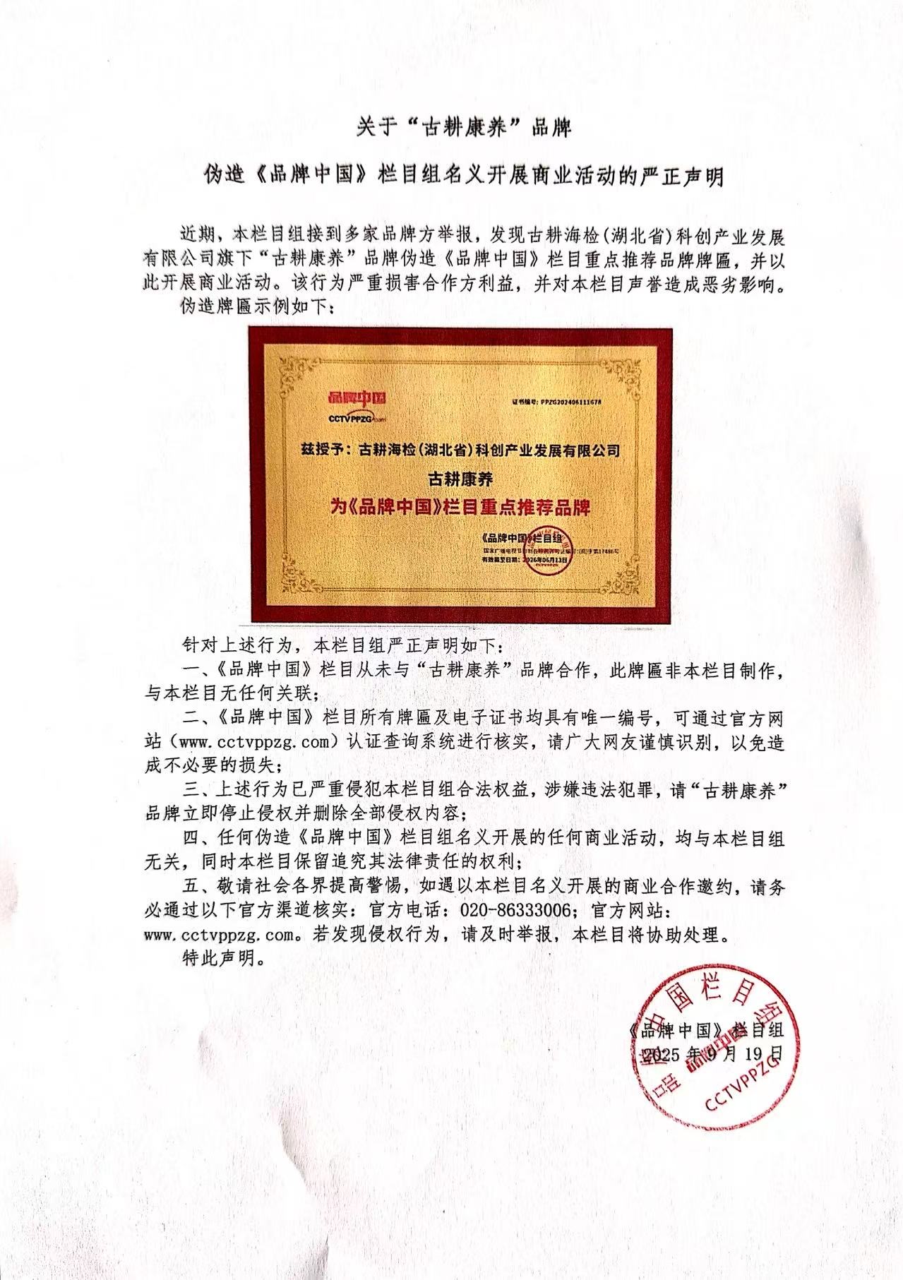 关于“古耕康养”品牌 伪造《品牌中国》栏目组名义开展商业活动的严正声明
