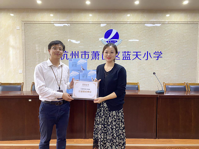 在捐赠仪式的尾声,校长占鸿飞代表萧山区蓝天小学,向《品牌中国》栏目组以及昆明雪兰牛奶有限责任公司授予了“公益爱心单位”荣誉证书。