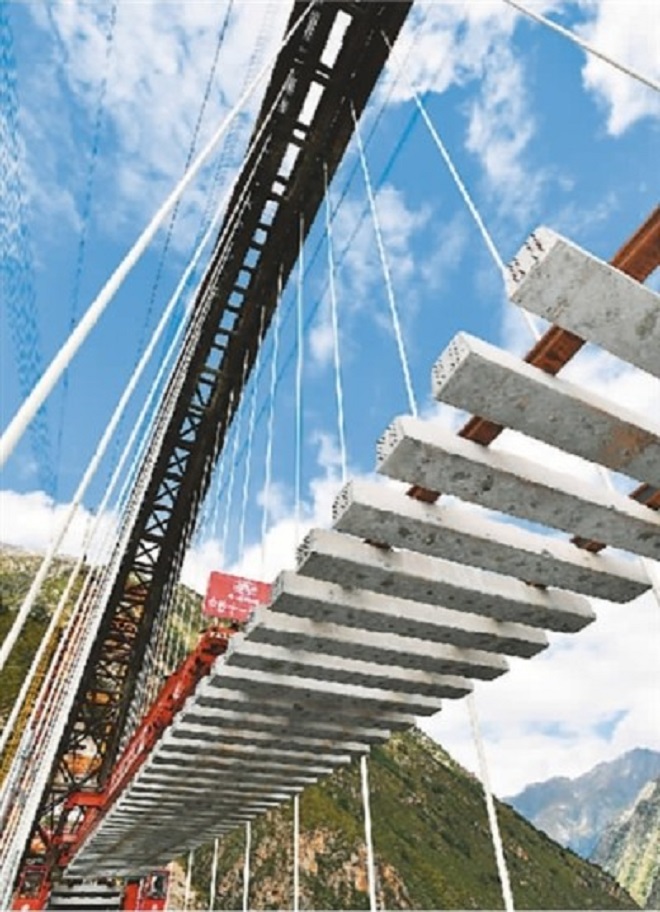 图为中铁十一局工程技术人员在藏木特大桥上铺轨。