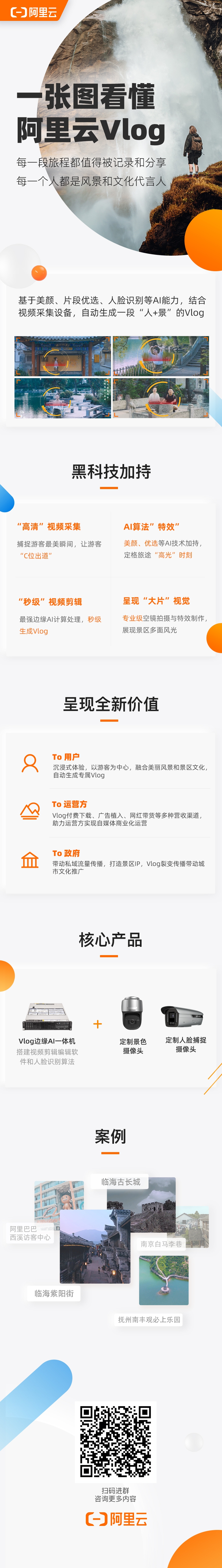 9月23日,阿里云正式发布了Vlog产品,该产品在景区及游客的视频素材基础上,用阿里云最新的物联网及 AI技术,自动生成“人+景”的Vlog短视频,让游客轻松获得专属的视频游记,而且游客可分享到各大社交平台,同时实现对景区美景和文化的互动传播。目前,该产品在台州府城旅游区首发。
